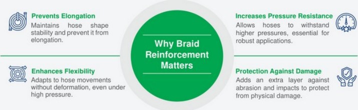 ข้อได้เปรียบหลักของ ท่อเสริมถักเปีย อยู่ในการผสมผสานระหว่างการเสริมแรงเคฟล่าร์และการถักเปียสแตนเลส เส้นใยเคฟล่าร์ถูกนำมาใช้กันอย่างแพร่หลายในการบินและอวกาศ อุปกรณ์กันกระสุน และสาขาอื่นๆ เนื่องจากมีความต้านทานแรงดึงสูงและมีคุณสมบัติน้ำหนักเบา ในท่อเสริมแบบถักเปียนั้น เส้นใยเคฟล่าร์ถูกใช้เป็นชั้นเสริมแรง ซึ่งไม่เพียงแต่ช่วยเพิ่มความแข็งแรงของท่อเท่านั้น แต่ยังช่วยเพิ่มความยืดหยุ่นและทนต่อแรงกระแทกอีกด้วย การถักเปียด้วยสเตนเลสสตีลช่วยเพิ่มความต้านทานการกัดกร่อนและความต้านทานการสึกหรอของท่อ เพื่อให้สามารถรักษาประสิทธิภาพที่มั่นคงในสภาพแวดล้อมที่รุนแรงได้